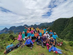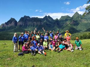 Lá em cima a vista maravilhosa , céu aberto e cadeia de montanhas ao fundo, serviu de cenário para foto de toda a turma, já batendo a saudade.