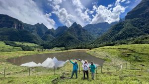 Na descida todo cuidado era pouco, com pedras soltas e úmidas, fomos descendo e acrescentando à paisagem nossas roupas coloridas. A experiência e sabedoria se fez presente pelos caminhos sinuosos até chegar no verde vale e avistar o refúgio onde sabíamos que seríamos acolhidos com um bom banho e um belo café colonial.